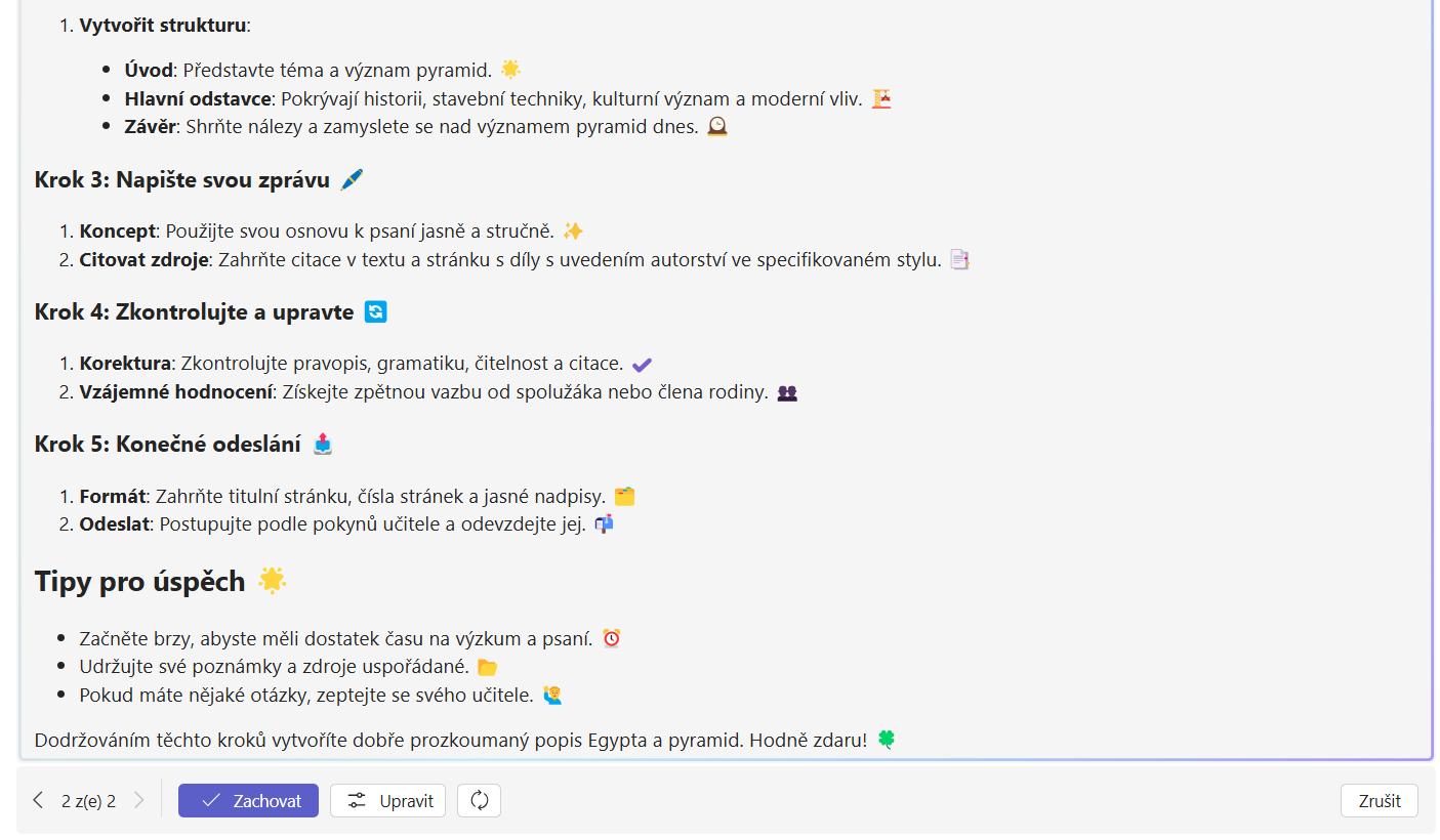 Obrovským benefitem je, že uživatel nemusí trávit čas tím, že bude x krát vkládat nový snímek, x krát vkládat nové textové pole, ale má během pár vteřin hodový nástřel prezentace (je to váš Copilot, ne náhrada). Takovou prezentaci si pak můžete doupravit dle svého, něco přidat nebo něco odebrat ale především dostanete zpracované téma v podobě, která by vás třeba nenapadla. A ostatně o tom celé používání generativní AI z části je.