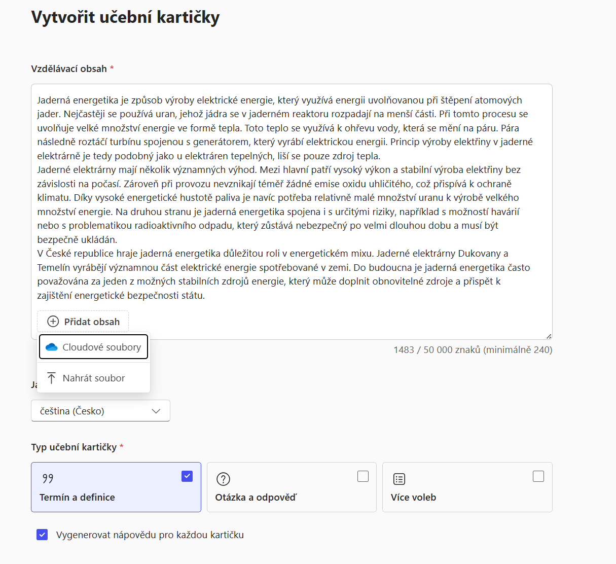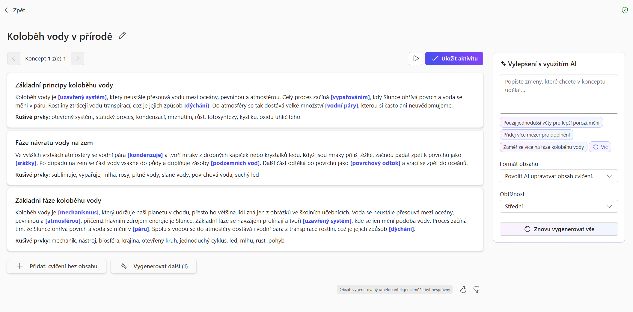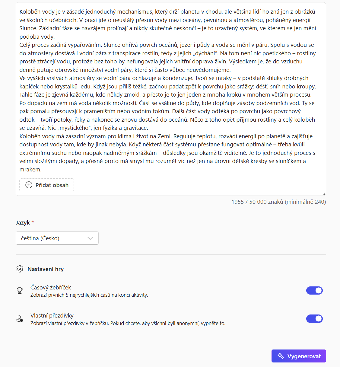 Princip vložení obsahu je stejný jako u paměťových kartiček, přesto zde jednu specialitu najdete – můžete si zvolit, zda nástroj má použít text přesně tak, jak je zadaný nebo jej může vzít jen jako tematický podklad pro vytvoření vlastního textu doplňovačky.