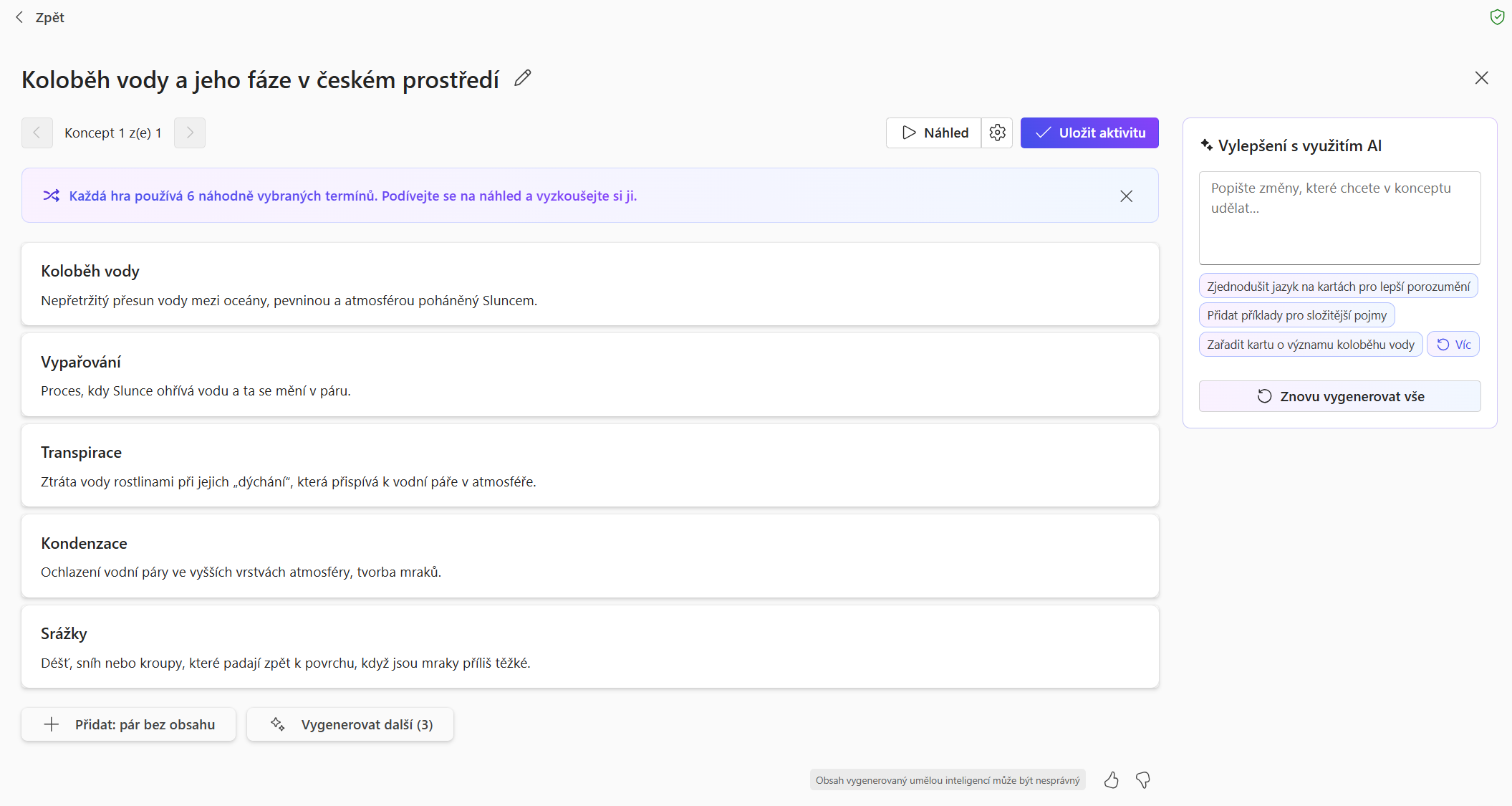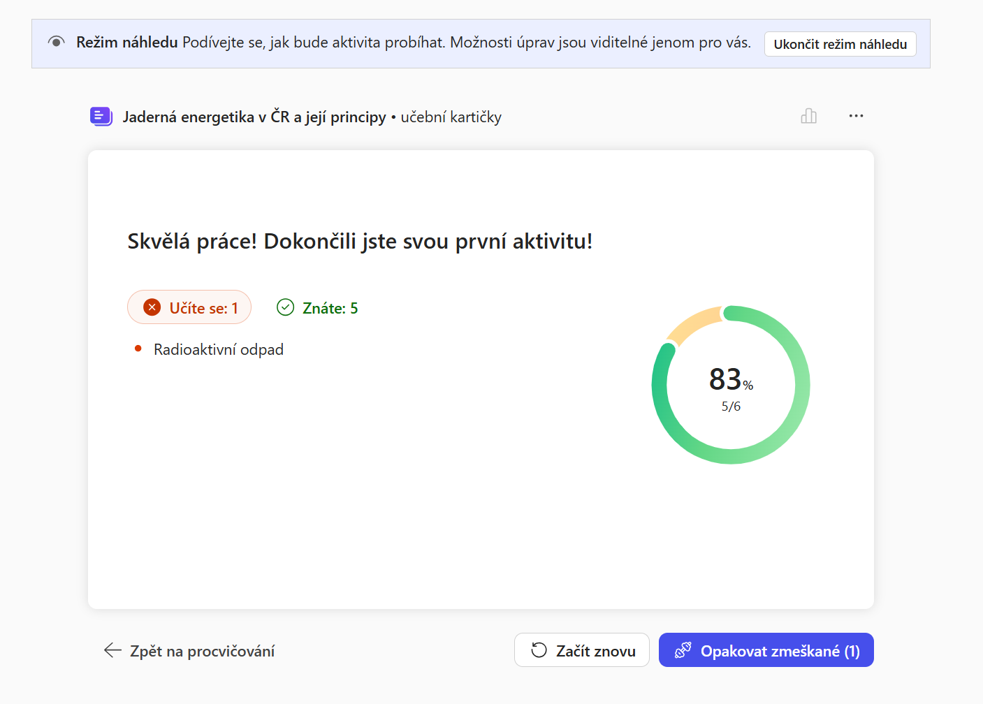 Jakmile žáci aktivitu dokončí, vy vidíte, kolik žáků aktivitu již dokončilo, s jakou úspěšností a dostanete i informaci, které kartičky byly pro žáky nejtěžší.