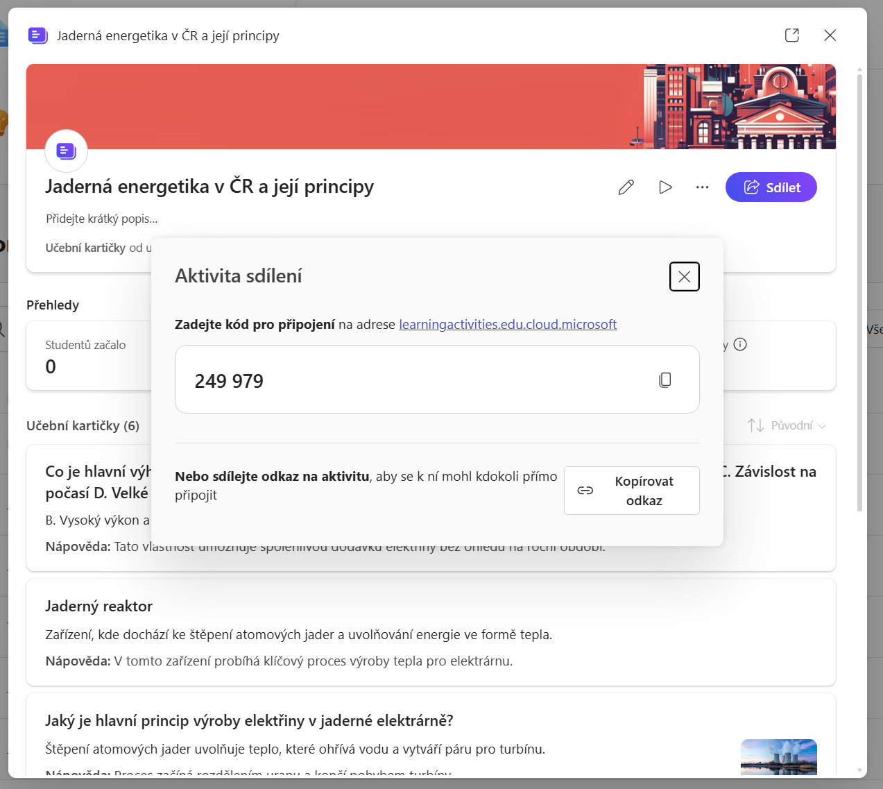 paměťových kartiček. Učitel vygeneruje odkaz nebo kód pro sdílení a žák jej co