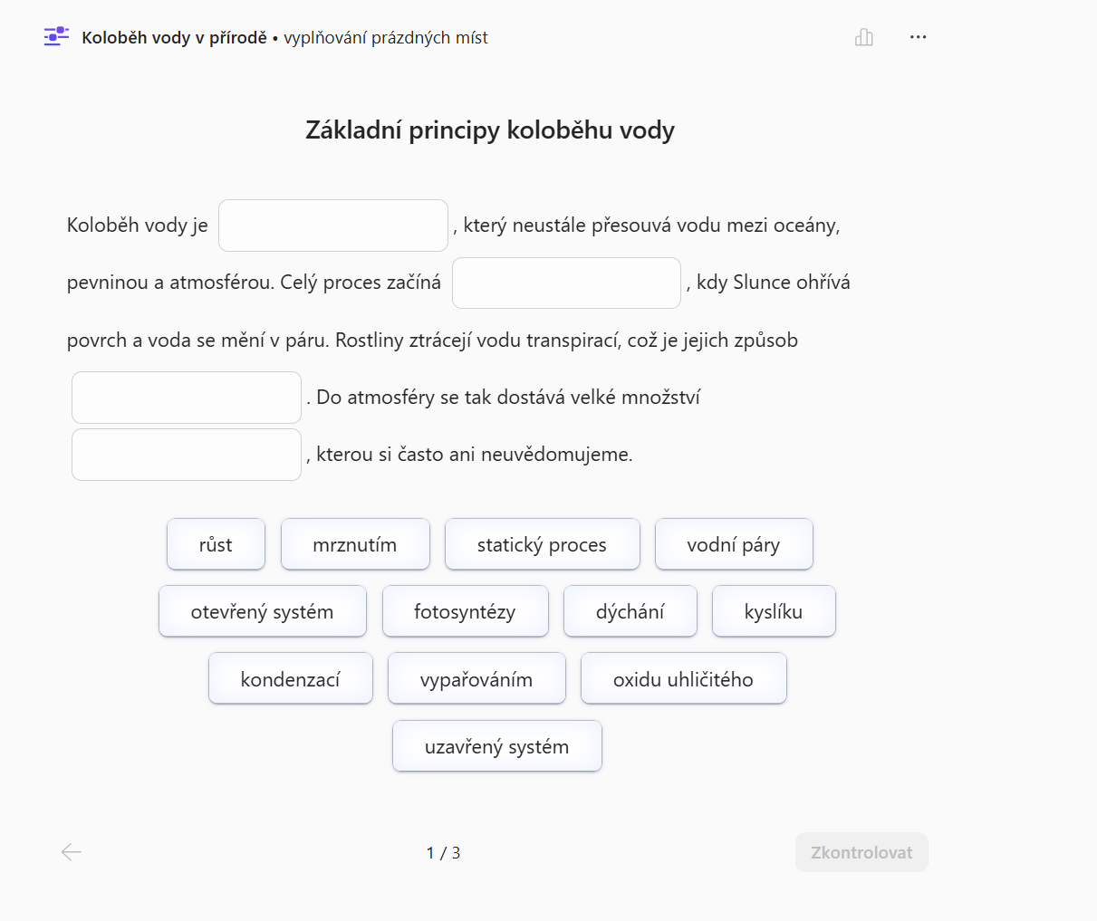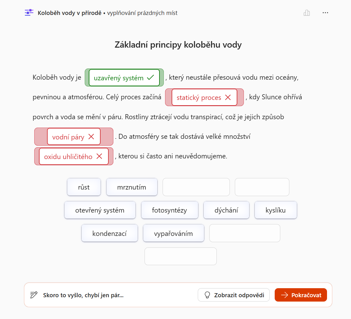doplňovačky, ve kterých mají žáci za úkol z nabízených pojmů doplnit do