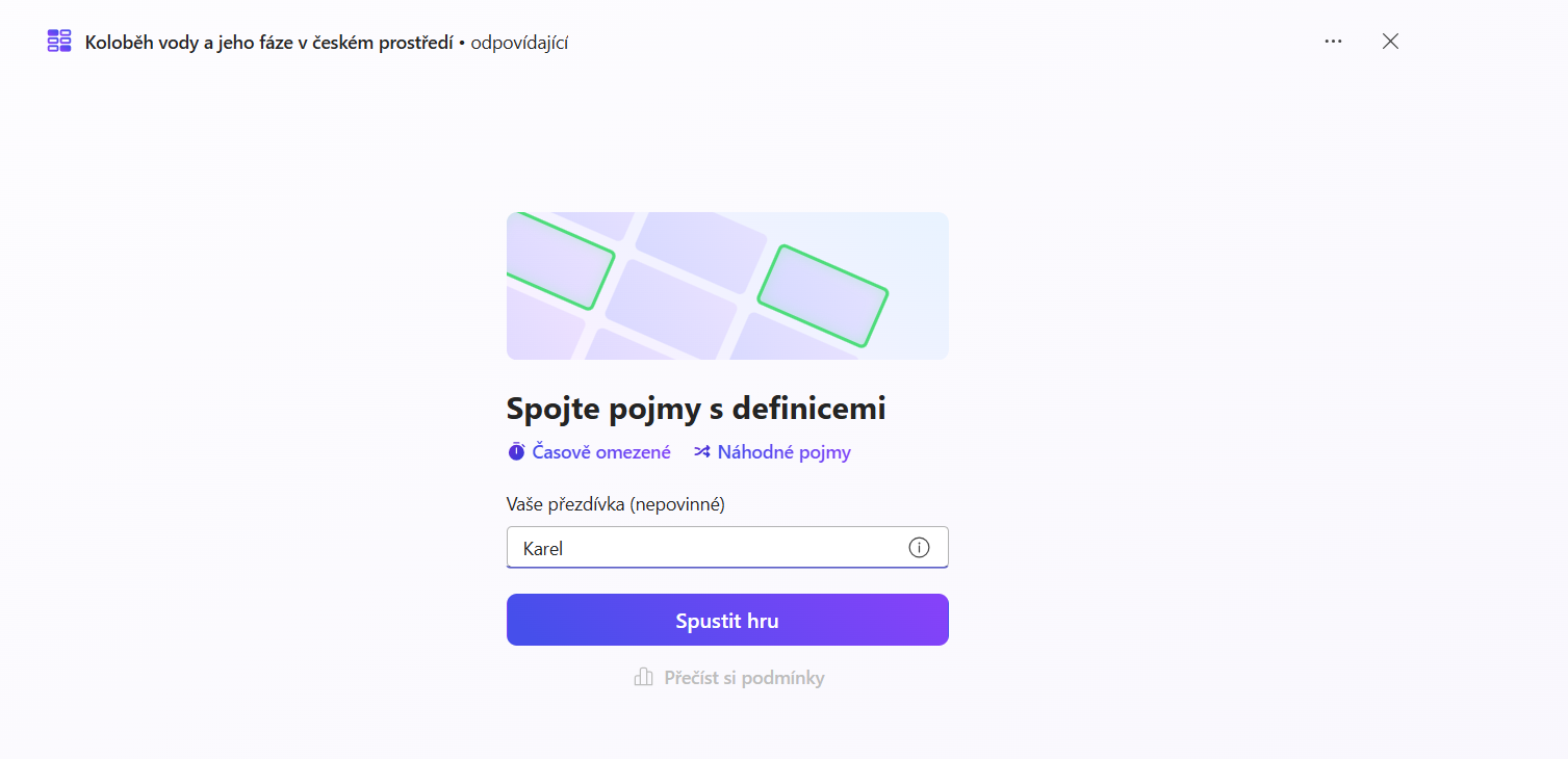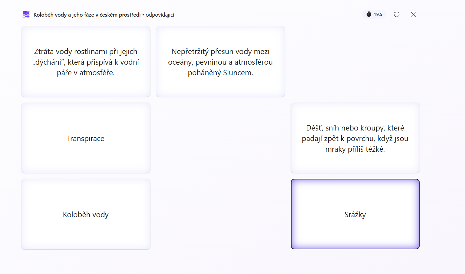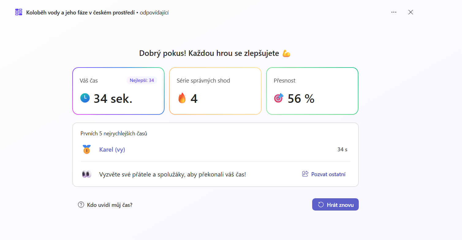 Při ní studenti soutěží, kdo jako první z nich vybere všechny páry správně. Po dokončení aktivity je vidět prvních 5 míst, která vidí všichni žáci a samozřejmě pak i učitel ve svém přehledu aktivity.